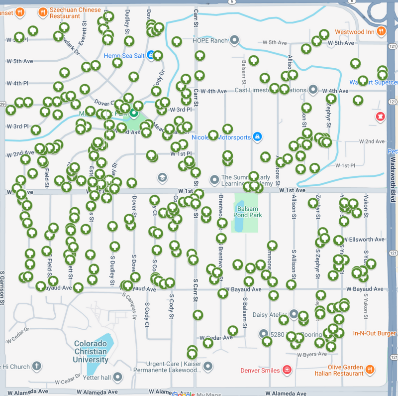 Here in the Mid‑Lakewood Civic Association neighborhood (Lakewood, CO), many of our stately ash trees are at serious risk from the invasive beetle Emerald Ash Borer (EAB). See the map below to see the various Ash Trees that have been documented in our neighborhood.